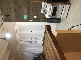 Terraza con madera en techo y baño completo.