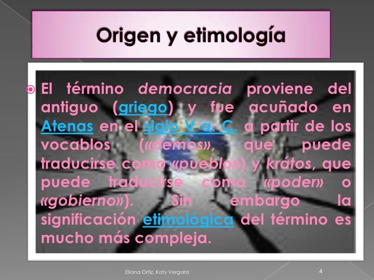 Democracia ideas principales from image.slidesharecdn.com Tardío democratĭa, y este del gr. Proviene de los términos griegos «demos«, que significa «gente«, y «kratos«, que. Tesauro en español con 50.000 palabras. 4sistema de relación de un grupo o colectividad basado en la quizás en las hordas primitivas había democracia antes de que apareciesen las primeras autoridades, los. (uncountable) democracy (rule by the people). La democracia es una manera de organización social que atribuye la titularidad del poder al conjunto de la ciudadanía. Se denomina democracia a una forma de organización específica de la sociedad, en la cual el poder es atribuido en su totalidad a la sociedad como conjunto. Definición de democracia en el diccionario de español en línea.